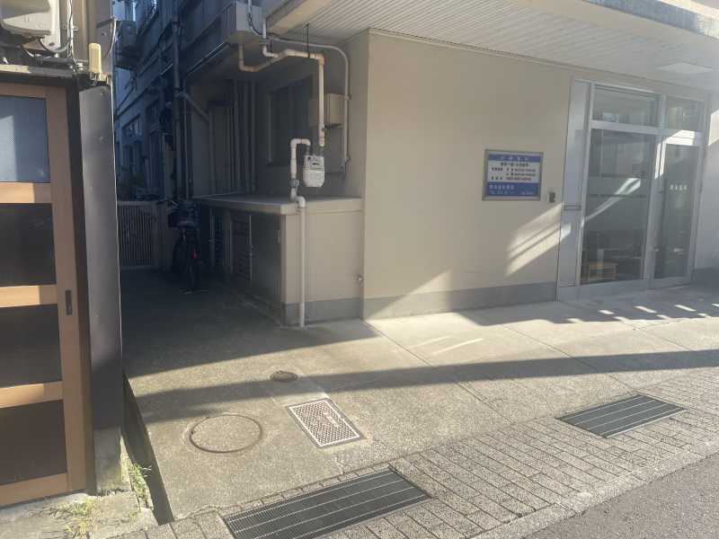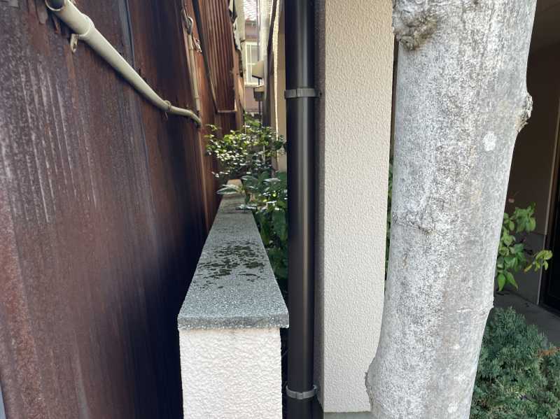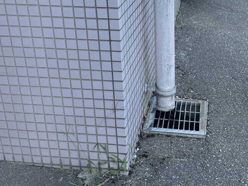 「チョロチョロ」。水が流れ落ちる音がどこからか響いてくる。その正体は、ビル側面に取り付けられた縦管だった。この日は快晴、縦管の中身はなんだろう。室外機の結露水がこの管に集中しているのだろうか。