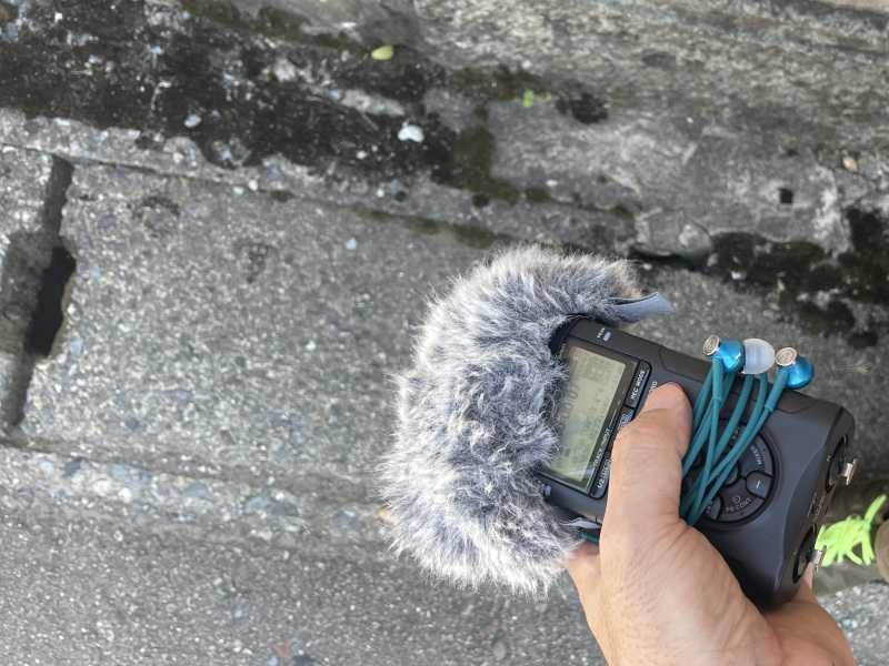 家と家との隙間には、静かな空間が広がっている。しかし、録音して音量を上げてみると、意外にも様々な音がひしめき合っていることが分かる。背後からは水が勢いよく流れる音が、奥からは室外機の音が聞こえてくる。ぼくたちの耳は、そうした音を自動的に聞き流すことを選んでいるのだ。