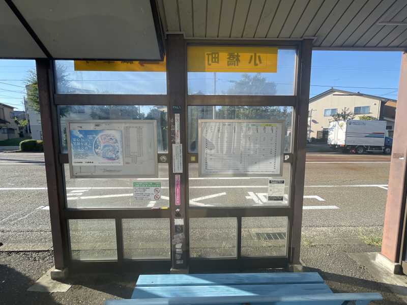 武蔵方面行きの小橋町バス停。逆方向の森山町行きバス停は、彦三大橋を渡った先にあり、少し離れている。このバス停は町中にありながら、車通りが少なくなる時間帯がある。そのとき、周囲は静まり、ゆったりとした時間が流れ、鳥のさえずりが聞こえてくる。