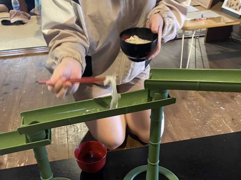 「カツッ、カツッ」。箸を勢いよく水路にぶつける音が響く。それは、流しそうめんを掴もうとする努力の音でもある。流しそうめん器は、モーターで水を循環させ、上部のししおどしに水が貯まると一気に流れ出す。なお、この日に流れていたのはそうめんではなく、氷見うどんだった。そうめんより少し太く、言われるまで気が付かなかった。