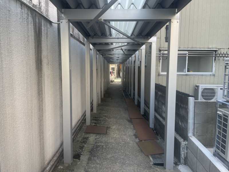 大和温泉の裏手から表側へと抜ける私道がある。入口には「ゆ」と書かれたサインが掲げられており、この抜け道は駐輪場も兼ねているようだ。風がよく通り、涼しげな音が響く。そのなかに、「ザバァーン」「カコーン」という音が混ざって聞こえてくる。熱いはずのお湯が勢いよく流される音は、むしろ涼しさを演出しているかのようだ。