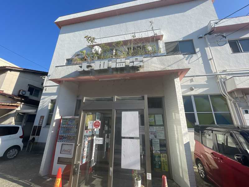 音は、温泉の前に備え付けられた自販機から聞こえる。もしかすると、自販機の背後に室外機が隠れているのかも。そこへ、「ピシャリ」と音を立てて、おじいさんが大和温泉へ入っていく。その入口に掲げられた「大和温泉」の文字は、意外にもかわいらしいフォントだ。そして、ここは銭湯ではなく温泉なのだと、今さらながら気づかされた。