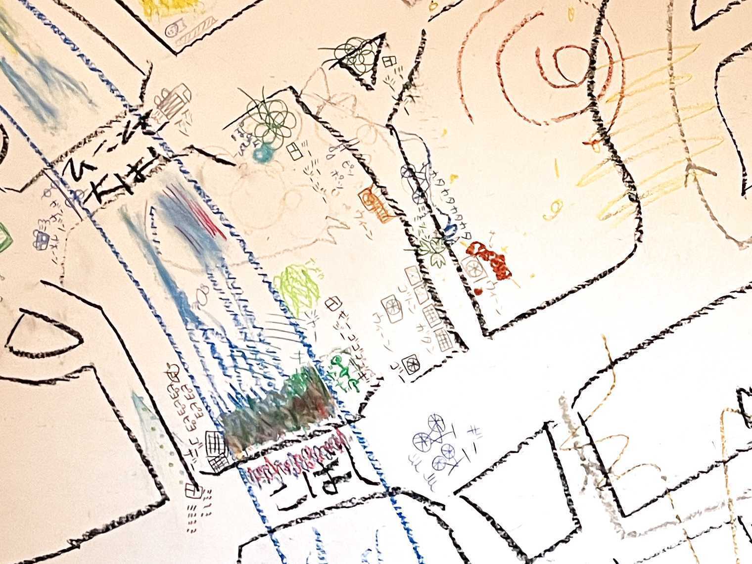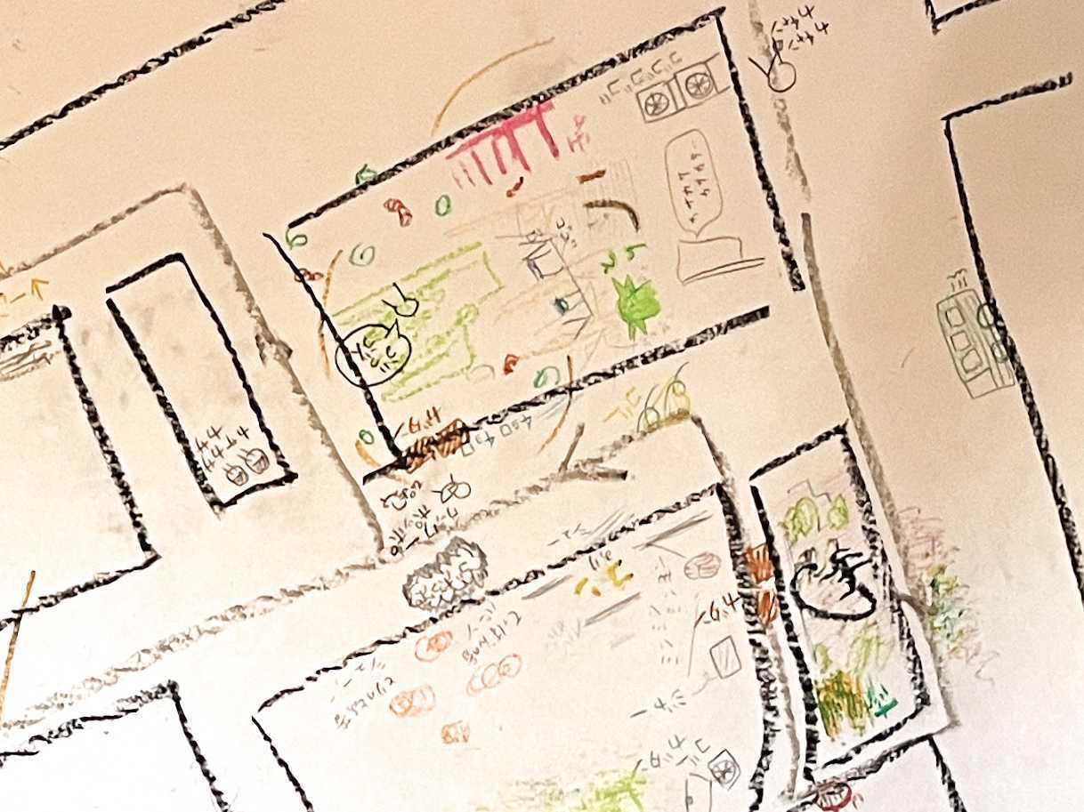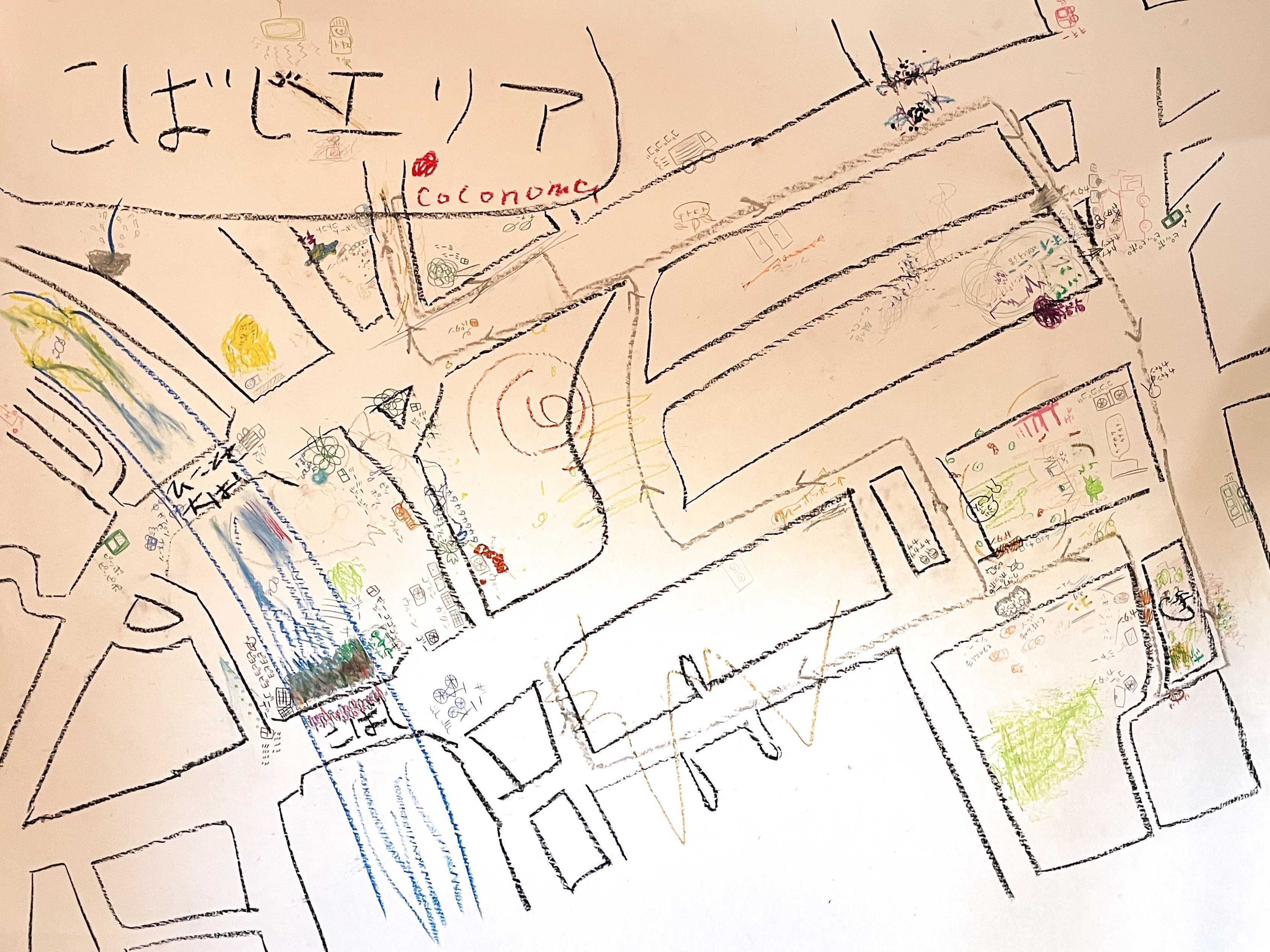 ワークショップ「まちを探検!音の地図を作ろう」で、みんなで描き上げたcoconomaカフェ周辺の「音の地図」と、そこで発見したさまざまな「音」を紹介しています。