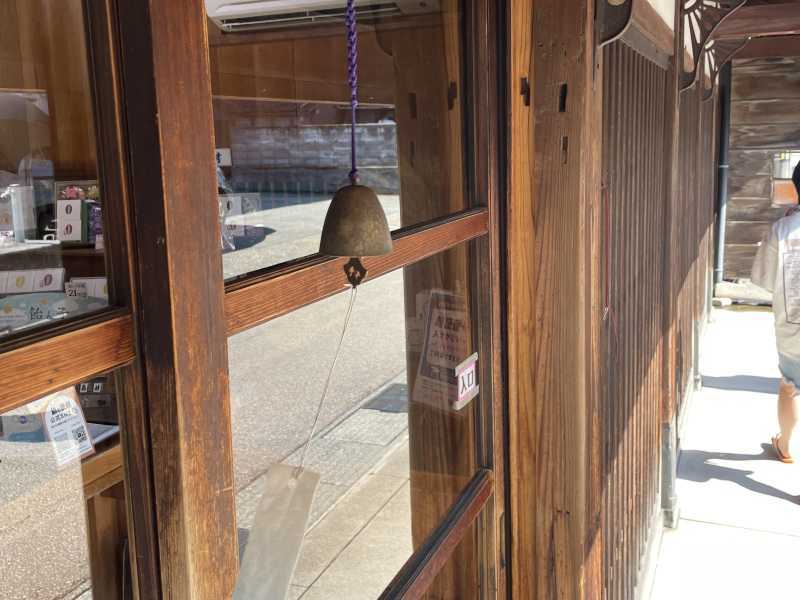 あめの俵屋の入口には、古風で小さな風鈴が取り付けられている。その舌(ぜつ)は、こだわりを感じさせる独特な形をしている。風が吹いたり、扉が開いたとき、「チリン」と少し硬めの音が響く。その音は、風の気配や来客の気配を、中にいる人へとそっと伝えている。