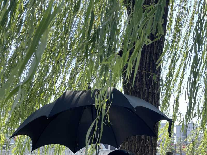 柳を傘でつつく。サラサラとした乾いた音を想像していたが、実際には布同士が擦れるような、ややゴワついた音だった。もう少し風があれば、また違った音が聞こえたのかもしれない。小橋には、一本だけ柳が立っている。その足元には手作りの風車が添えられていたが、今日は回っていなかった。やはり、風がないのだろう。